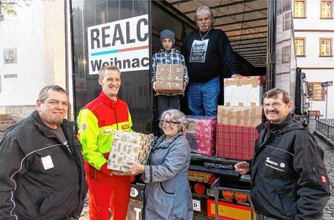 Der Johanniter-Weihnachtstruck machte auf seiner Tour durch Bayern am Samstag in Kitzingen Station auf dem Platz der Partner Städte und sammelte Spendenpäckchen zur Sicherung der Grundversorgung bedürftiger Menschen in Osteuropa. Immer wieder brachten Bürger (im Bild Karin Böhm mit Betriebspersonal) Päckchen vorbei. Im Vorjahr, so Pressesprecher Christoph Fleschutz, wurden mehr als 51 000 Päckchen für Kinder und bedürftige Erwachsene in Albanien, Bosnien und Rumänien gesammelt und transportiert. Die Spendenpäckchen werden in Landshut gesammelt und machen sich dann in vier Lkw-Konvois auf die Reise. Die Sammelaktion endet am 23. Dezember. Bis dahin können Spendenpäckchen bei Lidl und ATU in Kitzingen abgegeben werden.