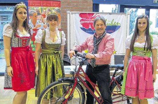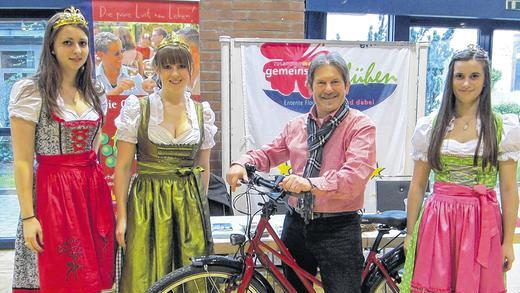 Rund ums Rad ging es am 18. Radreise-Markt des ADFC in Frankfurt. Schon zum Inventar dort gehört das Team der Touristinformation Kitzingen, das auch die Werbegemeinschaft „Die Gastlichen Fünf“ mit Gerolzhofen, Volkach, Dettelbach und Iphofen vertrat. Kitzingens Tourismus-Chef Walter Vierrether stellte Infos für 2014 vor, unter anderem den Mainradweg und den Veranstaltungskalender. Das Kitzinger Team informierte auch die Gäste über die „World Press Photo“ in Kitzingen sowie über „Entente Florale“, wo Kitzingen und Sommerach Deutschland auf europäischer Ebene vertreten. Mit Blumensamenpäckchen und weinseligen flüssigen Grüßen punkteten die „Hoheiten“ beim Publikum. Im Bild von links Madlen Kreßmann (Siedlerkönigin Kitzingen), Regina Ehrlich (Weinprinzessin Albertshofen), Walter Vierrether (Tourist-Info Kitzingen) und Lorena Wolf (Weinprinzessin Kleinlangheim).