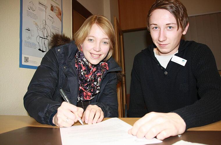 Am Schreibtisch sitzt der Auszubildende Julien Wagner. Er begrüßt jeden Neuankömmlings, prüft dessen Ausweis und legt ihm dann die Unterschriftenliste hin. Die junge Dame, die eben hereingekommen ist, heißt Mona Lückenhaus. Die 20-Jährige kommt aus Hohenfeld, studiert derzeit in Augsburg Wirtschaftsrecht und setzt behände ihr Autogramm auf Wagners Liste. "Ich finde, dass Bildung für jeden frei sein sollte", stellt sie fest, während sie ihren Personalausweis wieder ins Portemonnaie steckt. "Auch für diejenigen, die nicht so viel Geld haben."