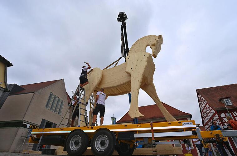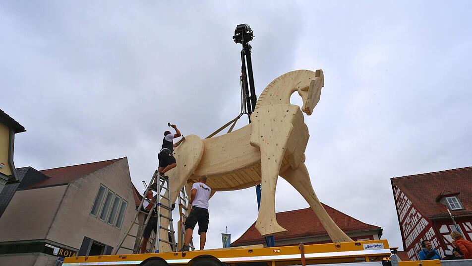 Das Pferd in Iphofen wurde von einer Zimmerei aus Franken eigens für die Ausstellung angefertigt. Es soll bis zum Ende der Ausstellung im November auf dem Marktplatz stehen.