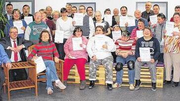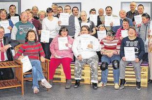 Für die Leistungen und für ihren Einsatz an den Standorten in verschiedenen Arbeitsbereichen, wurden die Mitarbeiter bei der Jubiläumsfeier geehrt. „Ohne Sie alle könnten die Mainfränkischen Werkstätten Kitzingen ihre Ziele nicht verwirklichen“, lobte Werkstattleiter Günter Müller. Jeder Mitarbeiter erhielt von Müller, Aufsichtsrat Manfred Markert und Elternbeirat Christine Scholler Urkunde und Geldpräsent. Folgende Personen wurden geehrt: