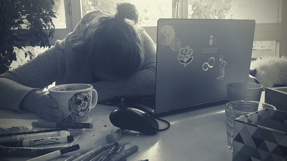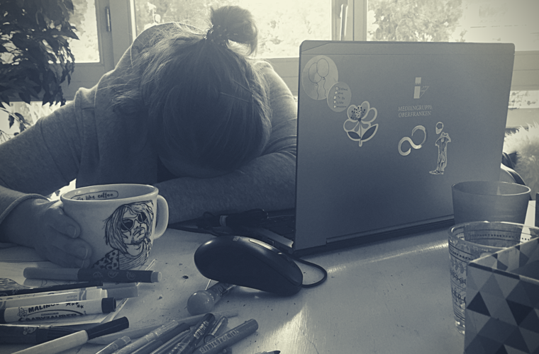 Also reiße ich mich zusammen. Akzeptiere, dass aktuell meine größte Herausforderung eigentlich nur darin besteht, beim Video-Call nicht aus Versehen laut zu rülpsen oder vor Schreck laut zu schreien, wenn mir mein eigenes ungeschminktes Antlitz entgegenblickt, bevor der Kollege oder die Kollegin den Anruf annimmt.