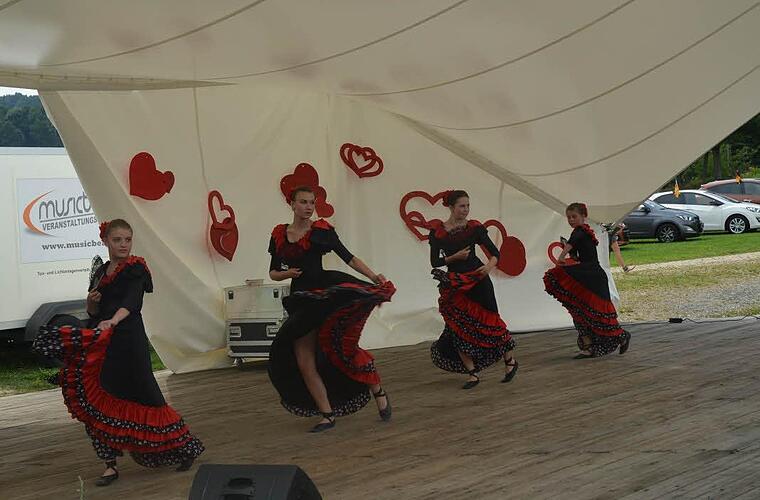 Gabi und Ralf antworteten darauf: "Ronny Söllner aus Neustadt bei Coburg hat uns bei einer gemeinsamen Fernsehproduktion im Studio angesprochen, ob wir nicht Lust hätten, in den Frankenwald zu kommen und hier für hilfsbedürftige Menschen zu singen. Er erzählte von der tollen Atmosphäre der Open Air Gala von 1000 Herzen, bei der er selbst schon einige Male dabei war. Wir waren einerseits neugierig, andererseits sind wir sehr gerne bereit, Not leidenden Menschen zu helfen, deshalb haben wir spontan zugesagt, ohne natürlich zu wissen, dass es ausgerechnet ein so heißer Tag werden wird, aber es macht Spaß", sagen Gabi und Ralf lächelnd und schreiten auf die Bühne zu ihrem Auftritt. Gerhard Burkert-Mazur, der durch das umfangreiche Programm führte, freute sich, dass die Benefizaktion "1000 Herzen für Kronach" nun auch schon weit über Bayern hinaus bekannt und beliebt ist. In der zehnstündigen, farbenfrohen Show überzeugten die Künstler mit schmucken Kostümen und glanzvollen Choreografien und natürlich Liedern und Melodien die zu Herzen gingen, ebenso wie sich Trendtänze und moderne Schlager abwechselten. Die ganze Technik dahinter wurde hervorragend von Andy Mantey aus Gifting und Matthias Schülein aus Ziegelerden gemanagt.