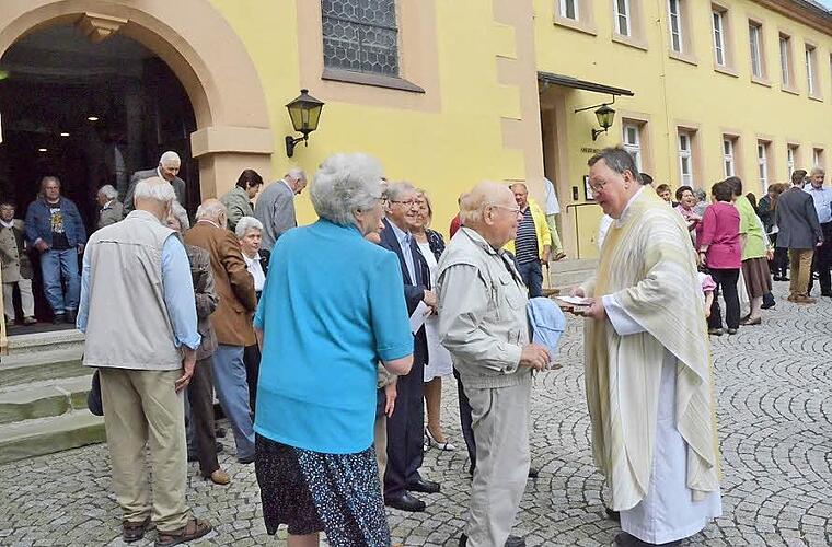 Nach Auszug aus dem Gotteshaus gab es auf dem Vorplatz der Klosterkirche zahlreiche Glückwünsche aus der Bevölkerung für den beliebten Pater, der auch zum Imbiss in den Kloster- Innenhof eingeladen hatte.