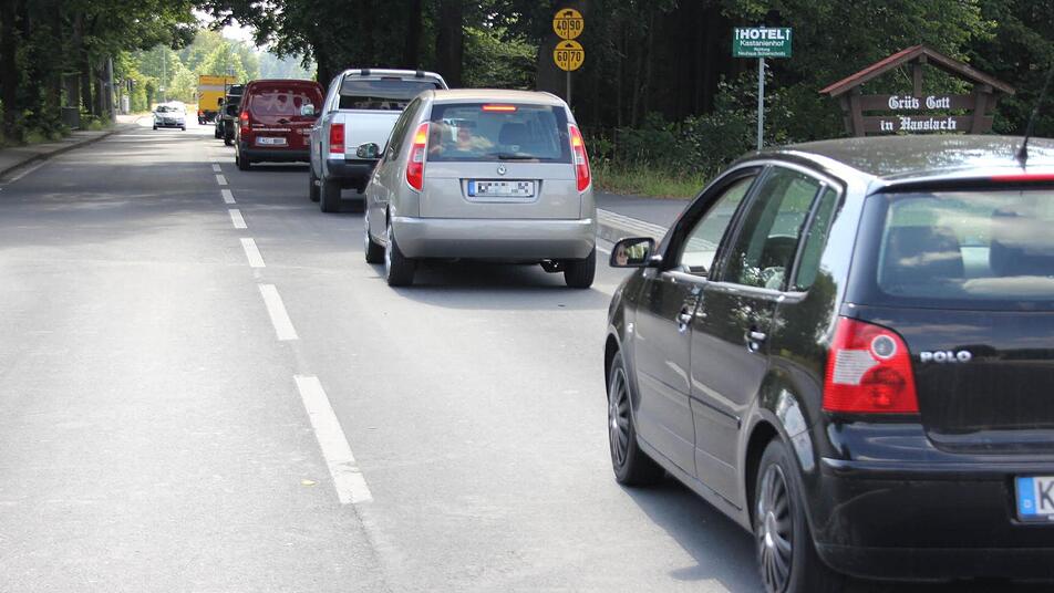Wenn die Autofahrer schnell reagieren, dann schaffen es gerade mal fünf Autos, bei Grün durchzukommen, steht ein Laster an vorderster Stelle, dann kommt maximal noch ein Auto durch, es sei denn, es fährt jemand bei "kirschgrün", wie mehrfach während unseres Fotografierens beobachtet. Weil die Linksabbieger warten müssen, kommen auch die Auto- und Lasterfahrer, die Richtung Stockheim nach rechts weiterfahren wollen, nicht durch, weil die Linksabbiegespur so kurz ist. Ergo: Der Verkehr aus Richtung Kronach staut sich bis zur Abzweigung nach Reitsch, manchmal bis nach Gundelsdorf, zurück.