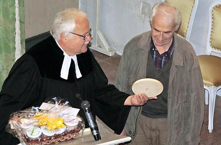 Pfarrer Albrecht Bischoff hatte für Heinrich Zschach zum Jubiläum eine großen Präsentkorb als Anerkennung seiner