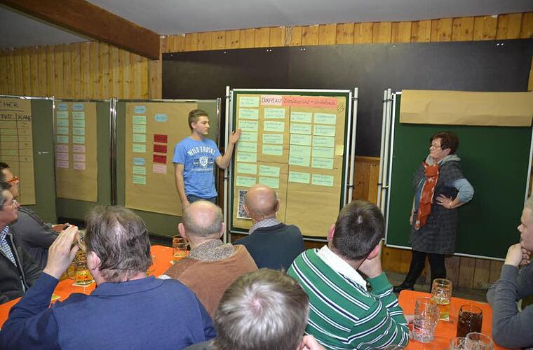 Die von den Teilnehmern erarbeiteten Vorschläge wurden von zehn Moderatoren vorgestellt und erörtert. In verschiedenen Schwerpunkten stellten sie den ihrer Meinung nach erstrebenswerten Soll-Zustand, dem Ist-Vergleich gegenüber. In den Vorschlägen fanden die zukünftige Gestaltung von Straßen, Brücken, des Grünbachs, des Dorfplatzes, ein Kinderspielplatz und vieles mehr, Berücksichtigung.