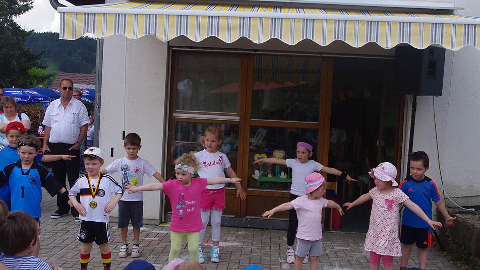 Eine ganze Stunde wurde auf der Freiluft-Bühne getanzt, gesungen und gespielt. Ob auf der Bühne oder im Publikum, jung oder junggeblieben: Die ganze Kita sang, klatschte und lachte mit.
