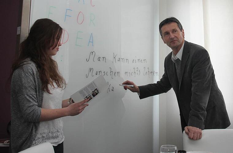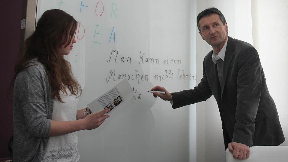 Wenn Alf Merkel von Schülerinnen erzählt, die in ihren Freistunden den Pinsel geschwungen oder beim Möbelaufbau zu dritt unter einem Schreibtisch gelegen haben, dann sind ihm die Begeisterung und der Stolz auf sein P-Seminar anzusehen. In der neuen Lernwerkstatt kommt es auf die vielen kleinen Details an. Auch auf dieses: Über dem weißen Sofa hängt eine Schiefertafel mit zwei chinesischen Schriftzeichen, die Merkel selbst erstellt hat: "Die Zeichen stehen für Kraft und Erfolg, das wünsche ich allen Gruppen, die hier Arbeiten."