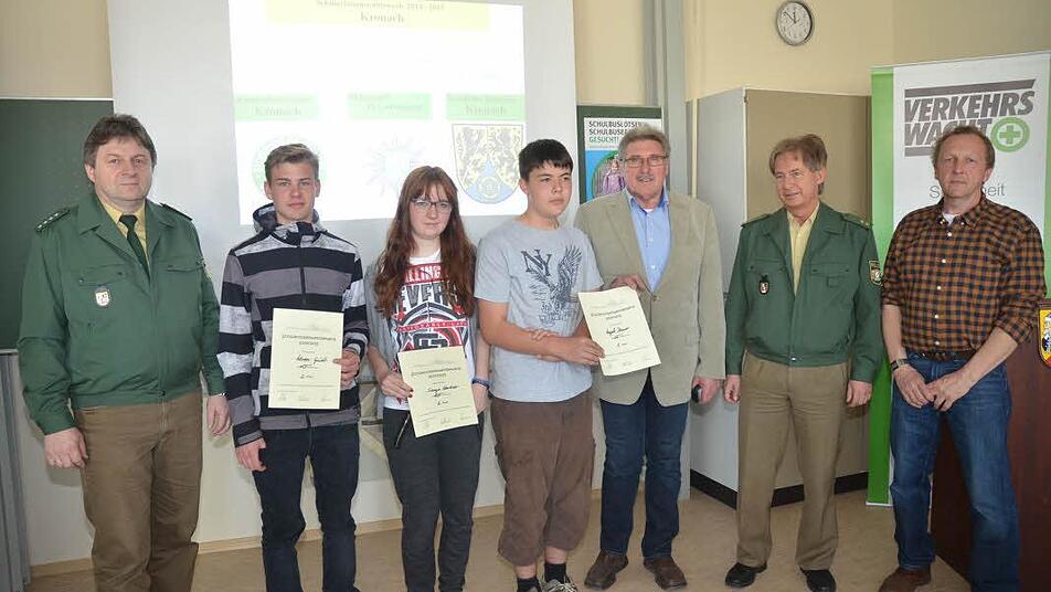 Die drei besten Schülerlotsen aus dem Schulamtsbereich Kronach nehmen am Bezirkswettbewerb am 20. Mai in Stockheim teil. Das sind: Angelo Bauer (106 Punkte), der bereits im vergangenen Jahr Kreis- und Bezirkssieger wurde und zwei Zweitplatzierte, Adrian Grüdl und Svenja Hartner (101,5 Punkte), die beide von der Mittelschule Pressig kommen.