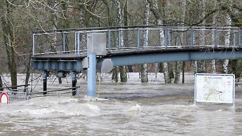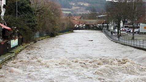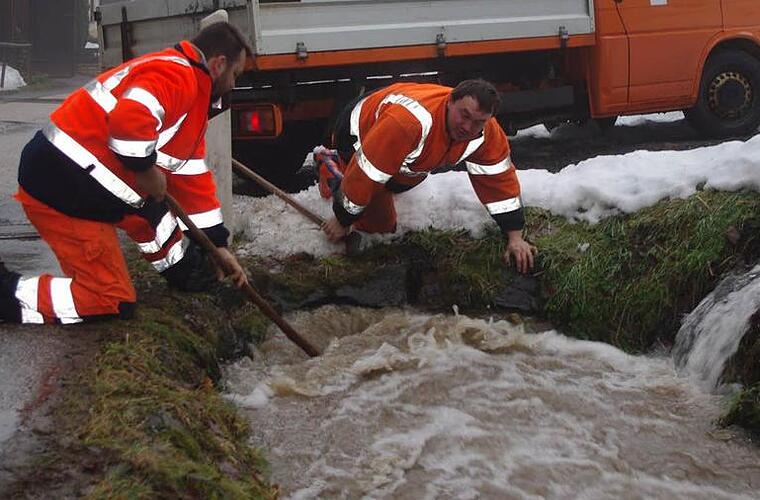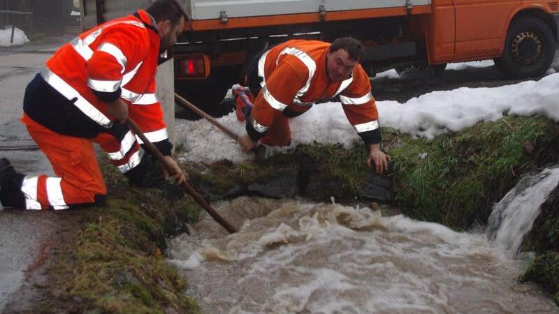 Die Schneemassen der vergangenen Wochen sind bei Temperaturen um die zehn Grad Celsius rasch abgetaut. Zu schnell für die Bäche und Flüsse, die jetzt in einem rasanten Tempo über die Ufer treten.