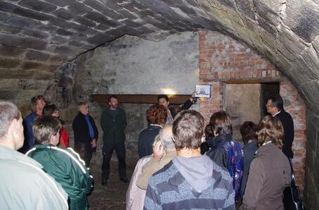 Eine weitere Kelleranlage wurde unter dem Pfarrhaus der katholischen Stadtpfarrkirche besichtigt. In den oberen Keller aus dem 18. Jahrhundert waren verschiedene gotische Elemente seines aus dem 15. Jahrhundert stammenden Vorgängerbaus integriert worden. Diese Verschachtelung sei typisch für die damalige Zeit, so Stefan Wicklein. Neben der militärischen Nutzung in Kriegszeiten beziehungsweise als Schutz vor Bombenangriffen seien die Keller auch als Steinbrüche verwendet worden, da Sandstein ein wertvolles Baumaterial für den Hausbau gewesen sei. Mit ihrer konstanten Temperatur von acht Grad Celsius seien die Keller zudem ideal für die Lagerung von Lebensmitteln gewesen - quasi der Kühlschrank der damaligen Zeit.