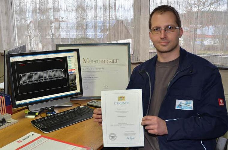 Das Meisterstück Sein Meisterstück war übrigens eine Sonderstahlkonstruktion eines Schreibtischs mit versenkbarem CD-Fach, erzählt er lächelnd. Um den hohen Qualitätsansprüchen im - nach DIN EN 1090 zertifizierten - Betrieb gerecht zu werden, absolvierte Thorsten Föhrweiser neben seiner Meistausbildung auch noch das Zertifikat des Schweißfachmanns. Zukünftig wird er einen Schwerpunkt auf die Ausbildung der Lehrlinge legen. Der Vater hat schon sechs Auszubildende in ihrem Beruf ausgebildet. In diesem Jahr will man wieder einen Auszubildenden einstellen und sucht noch nach Lehrwilligen, die den Beruf des "Metallbauers Fachrichtung Konstruktionstechnik" erlernen möchten, informiert der Jungmeister voller Stolz.