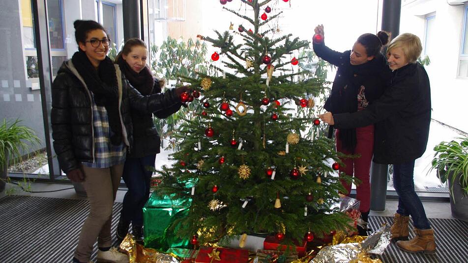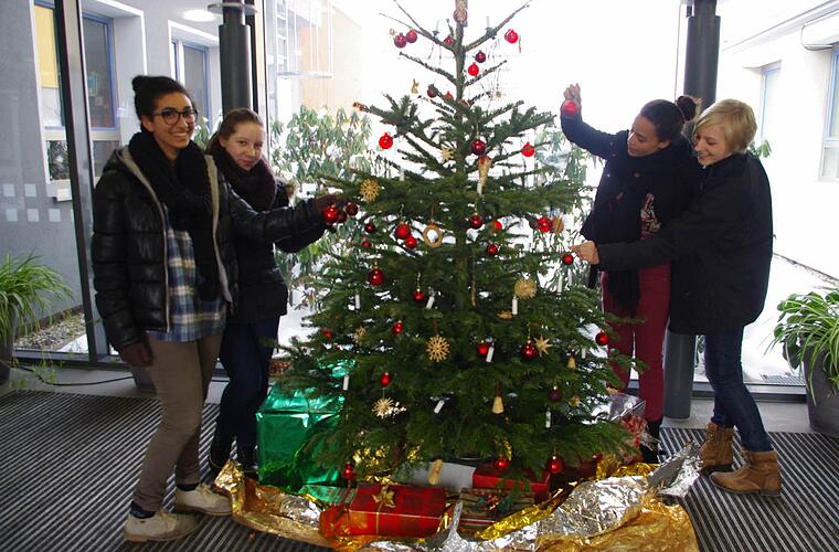 Anna, Anika, Zélie und Farrah schmücken den großen Weihnachtsbaum im Eingangsbereich des Kaspar-Zeuß-Gymnasiums mit roten Glaskugeln und Strohsternen. Zélie und Farrah helfen gerne, obwohl sie ja eigentlich "nur" Gast in Kronach sind. Ihre Heimat ist Lodève, eine Stadt mit rund 7300 Einwohnern im Süden Frankreichs.