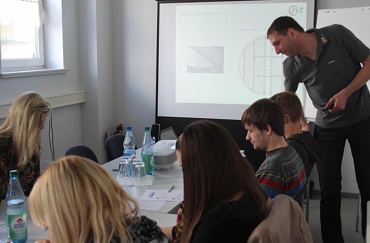 Unterschiedliche Kenntnisse Diesmal sind die Azubis bei einem Unternehmen zu Gast, dass auf dem Weltmarkt agiert, aber dennoch das Augenmerk für die Region nicht verlieren will. "Man muss sich um die jungen Menschen kümmern", stellt RVT-Geschäftsführer Herbert Rüger fest. Deshalb nimmt er sich vor dem Workshop auch selbst die Zeit, die jungen Leute mit vier Angestellten durch die Räume zu führen, das Produktionsspektrum von RVT zu erklären und auf die Ausbildungsmöglichkeiten einzugehen.