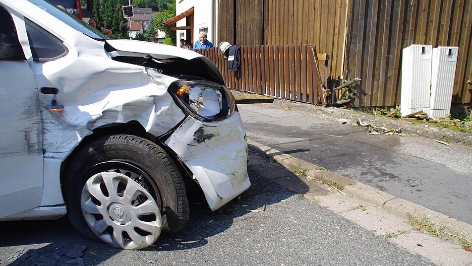 Ein Unfall mit einem Verletzten und einem Totalschaden ereignete sich am Montagvormittag in Weißenbrunn. Außerdem wurden eine Hauswand und ein Zaun beschädigt.