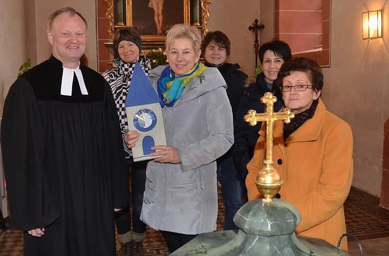 Aktiver Bastelkreis Sprecherin Sabine Schmidt erklärte: Damit die Turmuhr nicht fünf vor zwölf stehen bleibe, wie bei der Geldübergabe an einem kleinen, gebastelten Modell dargestellt, überreichten die Frauen 1700 Euro als Spende an Pfarrer Reinhold König. Der Bastelkreis besteht seit mehreren Jahren (etwa sieben bis acht Jahre). In diesem Jahr waren es 15 Frauen, welche regelmäßig gebastelt haben.