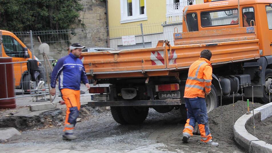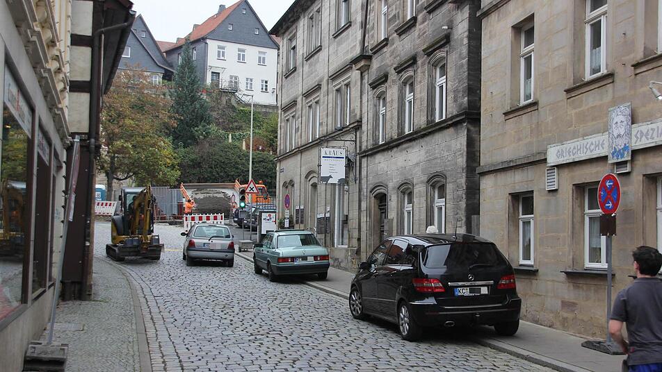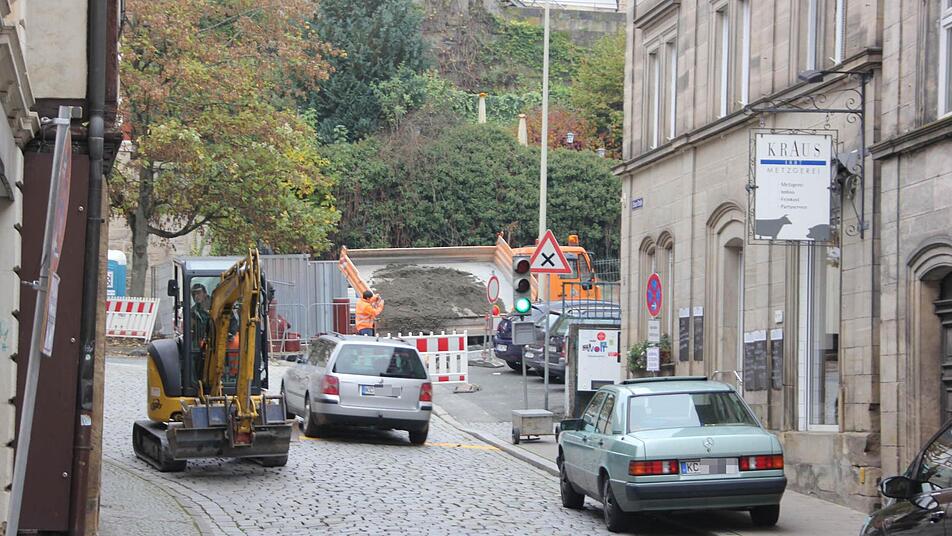 40 laufende Meter Kanal in der Rosenbergstraße in Kronach mussten diese Woche erneuert werden. Das sorgte wegen der Baustellenampel für Rückstaus bis zum Kaiserhof.