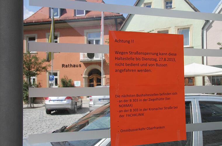 Inzwischen hängt an der Bushaltestelle am Marktplatz Stadtsteinach ein auffälliges rotes Schild, das darauf hinweist, dass die Haltestelle in den nächsten Tagen nicht angefahren werden kann und dass die nächste Zusteigmöglichkeit an der Ziegelhütte bestehe.