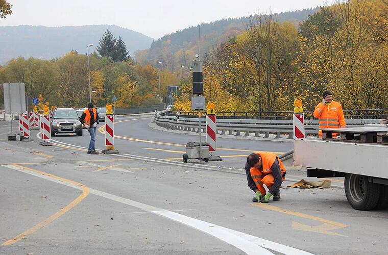 Die leuchtend gelben Fahrbahnmarkierungen werden im Lauf des Mittwoch entfernt, die Wartezeiten an den Baustellenampeln der Südbrücke gehören dann der Vergangenheit an, denn noch am Abend werden die beiden Lichtzeichenanlagen abgebaut.