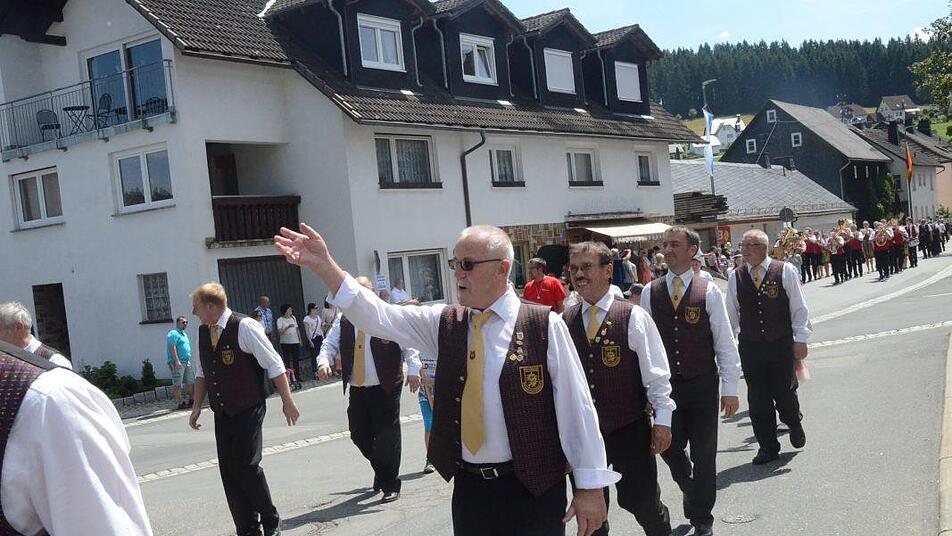 Der Festzug wurde nicht nur von Kapellen begleitet, sondern inspiriert von den Klängen der Blasmusik sangen die Gesangvereine einfach mit und verwandelten den Frankenwaldort in ein klingendes und singendes Dorf. Dazu trugen auch die begeisterten Passanten und Zuschauer mit bei. Auch sie stimmten am Straßenrand mit ein und konnten ihre Stimmen angesichts dieser großartigen Stimmung nicht zurückhalten und sangen die beliebten Marschlieder mit. Mit der Hymne an die Freundschaft eröffnete der Musikverein Frankenwald, unter Leitung von Stephan Schmidt, die kunterbunte Kundgebung auf dem Festplatz bei strahlendem Sonnenschein. "Der Herrgott muss ein Sänger sein", scherzte ein hocherfreuter Präsident des Fränkischen Sängerbunds, Peter Jacobi, angesichts des strahlenden Sonnenscheins über dem Festplatz und des sich farbenfrohen Bildes, das sich aus den zahlreichen Gesangsvereinen mit schmucken Trachten und Kostümen bildete.