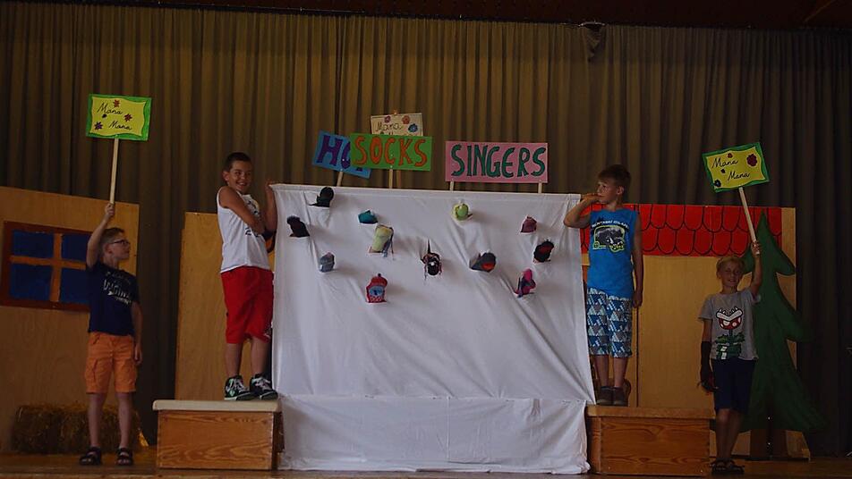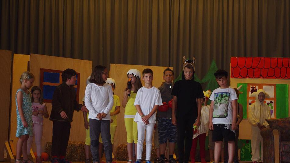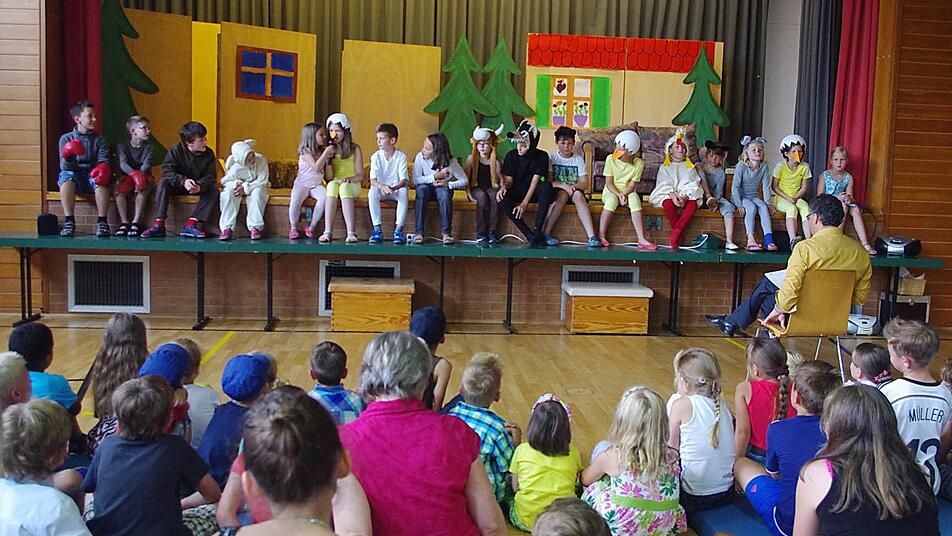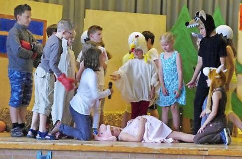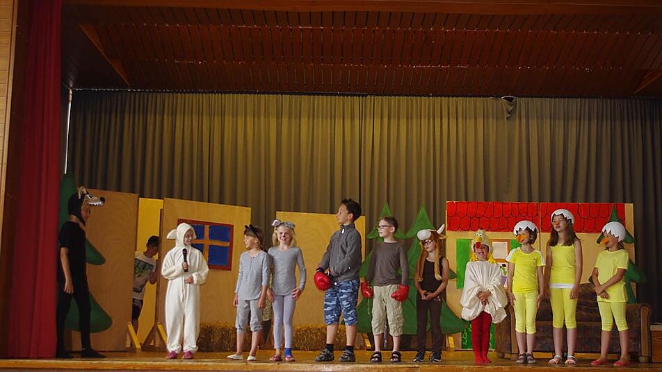"Schwein gehabt! Da rocken ja die Hühner" heißt das witzige Kinder-Musical aus der Feder von Gerhard A. Meyer, das die Schulspielgruppe in der Turnhalle Wilhelmsthal mit Musik, Gesang, Spiel und Tanz in Szene setzte. Unter Regie von Schulleiter Ulrich Weiß wurde um die Wette gegackert, gegrunzt, gefiept und geblökt. Sechs Monate hatten die Kinder geprobt und dabei die Choreografie ebenso einstudiert wie die Songs, die sie selbstbewusst als Refrain, im Chor und in Solopartien darboten.