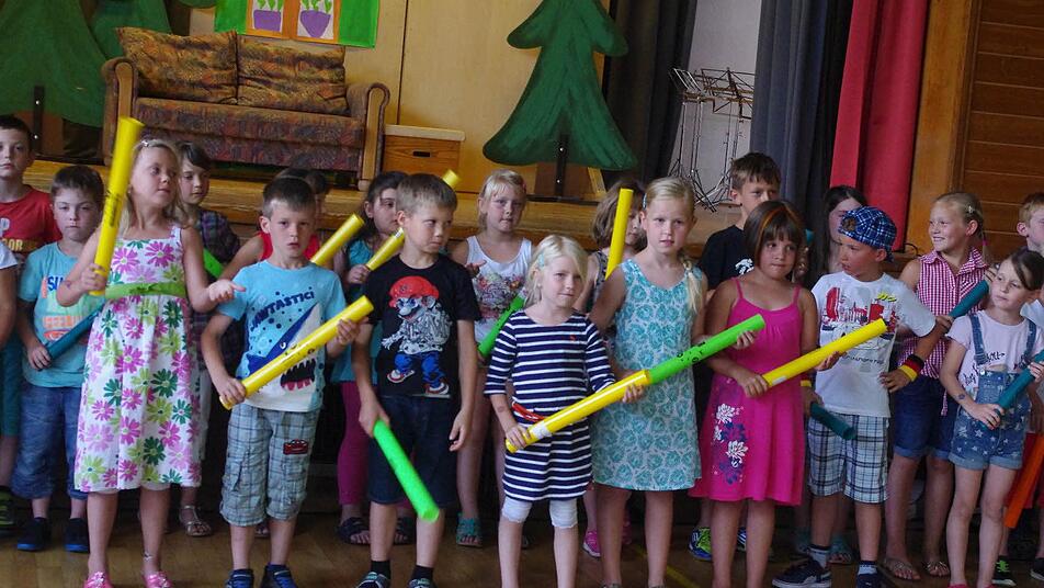 Für viele Lacher sorgte das Socken-Theater (3K4a) mit "Manamana", während die Klassen 1K2a und 1K2b mit ihren Boomwhackers - bunte, gestimmte Plastikrohre - viel Taktgefühl bewiesen. Das Bühnenprogramm schloss mit dem Lied "Ein Hoch auf uns" (Klasse 3K4c). Unter den Gästen waren auch Schulamtsdirektor Uwe Dörfer sowie Wilhelmsthals Bürgermeisterin Susanne Grebner.