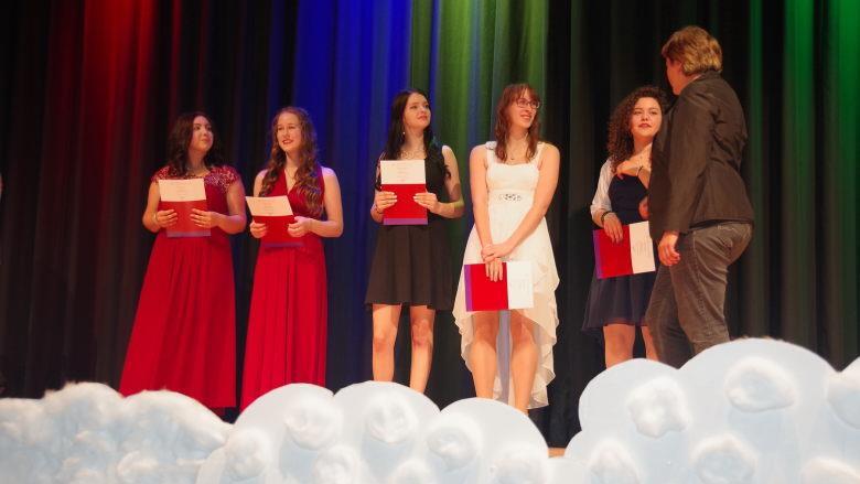 Erfreulicherweise erreichten 20 und damit - so Studiendirektorin Renate Steger - "gigantische" 83 Prozent von ihnen ihren Mittleren Bildungsabschluss. Als Jahrgangsbeste in ihren Berufen glänzten die staatlich geprüfte Kinderpflegerin Franziska Gehring (11.Klasse, FKI 11) mit einem Notendurchschnitt von 1,46 sowie die staatlichgeprüfte Helferin für Ernährung und Versorgung Emma Hümmer (11. Klasse, FEV 11), als auch die staatlich geprüfte Sozialbetreuerin und Pflegefachhelferin Greta Strehmel (11.Klasse, FSO 11) mit einem Notendurchschnitt von jeweils 1,2.