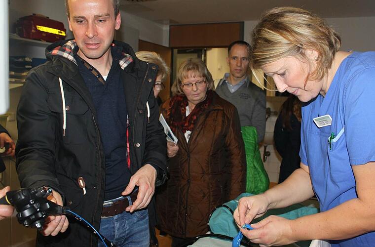 Nach der Begrüßung geht es weiter zur "Klinikrallye". Auf den verschiedenen Stationen können sich die Besucher einen Einblick in den Berufsalltag der Ärzte und Pflegekräfte sowie einen kleinen Überblick über die moderne Medizintechnik verschaffen. Eine Station beispielsweise ist das Herzkatheter-Labor. Dort wird unter anderem erklärt, wie ein Herzkatheter angelegt wird.