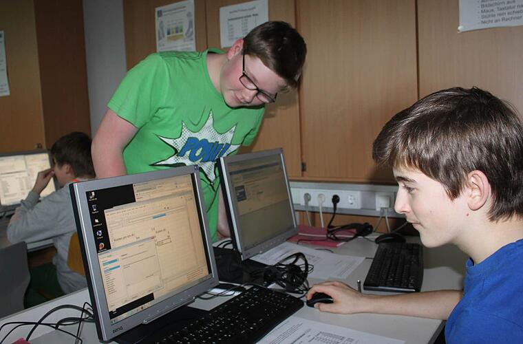 Die beiden Schüler tippen ihr Passwort ein. Schnell gelangen sie auf "Mebis". Dort, könnten sie sich einklicken in die Mediathek, in Prüfungsarchive, in Aktuelles, Beispielkurse etc. Sie tasten sich mit dem Mauszeiger weiter, bis sie schließlich zum Kurs Tabellenkalkulation gelangen. Dort befassen sich die 13-Jährigen mit ihrer Aufgabe.