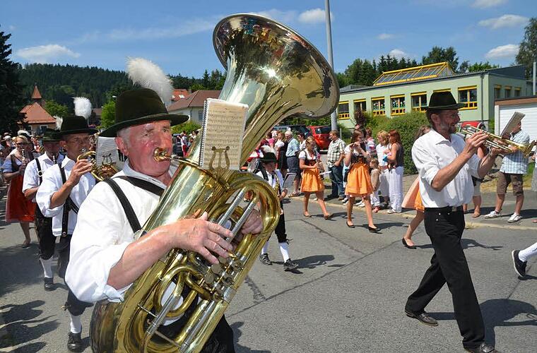 Schweißperlen auf der Stirn Der Musikverein Pressig erhielt sehr viele Glückwünsche zum 100-jährigen Bestehen. Ein Höhepunkt von mehreren, war sicher der Festzug am Sonntag, bei dem sich 17 Musikkapellen aus dem Frankenwald und weitere örtliche Vereine und Gruppen mit Fahnenabordnungen bei strahlendem Sonnenschein mit wohltuenden Klängen durch die Straßen schlängelten. Sie brachten das Haßlachtal mit Blasmusik zum Erklingen und trafen sich anschließend trotz Schweißperlen auf der Stirn zum Gemeinschaftschor.