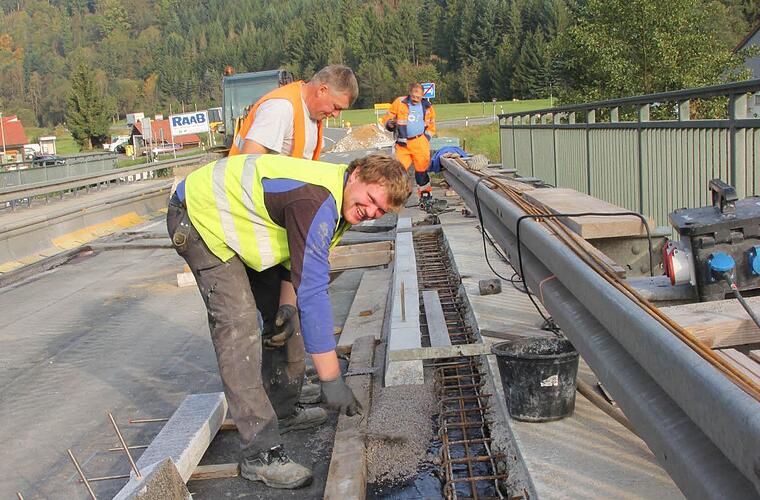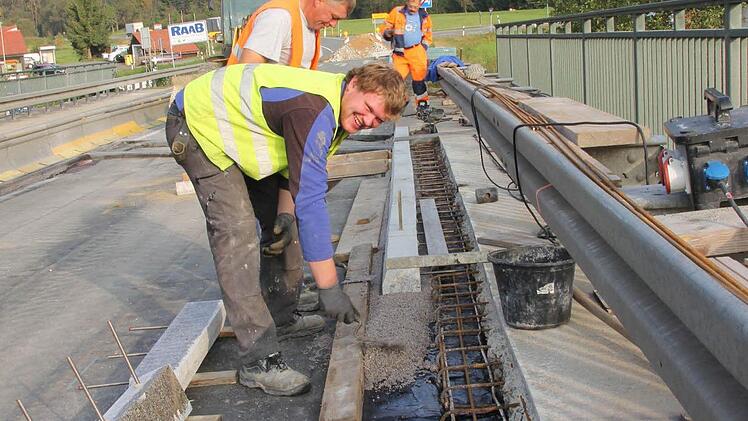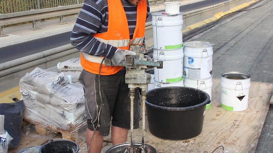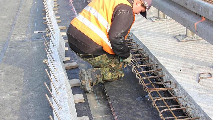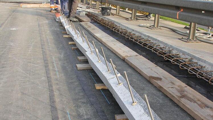 Die Feuchtigkeit kann abfließen Die Bauarbeiter haben zunächst die Asphaltschicht abgefräst und einen Streifen des Betons samt Bordsteinen entfernt, um die Stahlarmierung freizulegen. Anschließend wurde abgedichtet und dafür gesorgt, dass eindringendes Wasser durch Tropftüllen nach unten abfließen kann. Wer sich von den die Baustelle passierenden Autofahrern gefragt hat, warum dort Steine liegen, aus denen Eisen ragen, für den hat Vorarbeiter Georg Kunzelmann die Antwort: "Die Granit-Bordsteine müssen im Beton, den wir dahinter gießen werden, fest verankert werden, denn wenn ein Laster den Bordstein mit den Reifen streift, lockert sich der Stein."