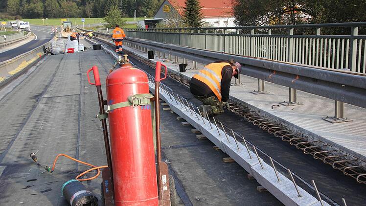 Die Brücke der Ortsumgehung in Wallenfels-Ost ist seit Wochen halbseitig gesperrt, weil sie saniert werden muss. Arbeiter der Ebensfelder Firma Raab haben zunächst die Fahrtrichtung Hof neu gemacht, nun ist die Fahrtrichtung Kronach dran. Die Gesamtkosten der im Zuge der Ortsumgehung von Wallenfels im Jahr 2002 errichteten Brücke bezifferte Jürgen Woll, Leiter der Servicestelle Kronach des Staatlichen Bauamts Bamberg, mit 190 000 Euro.