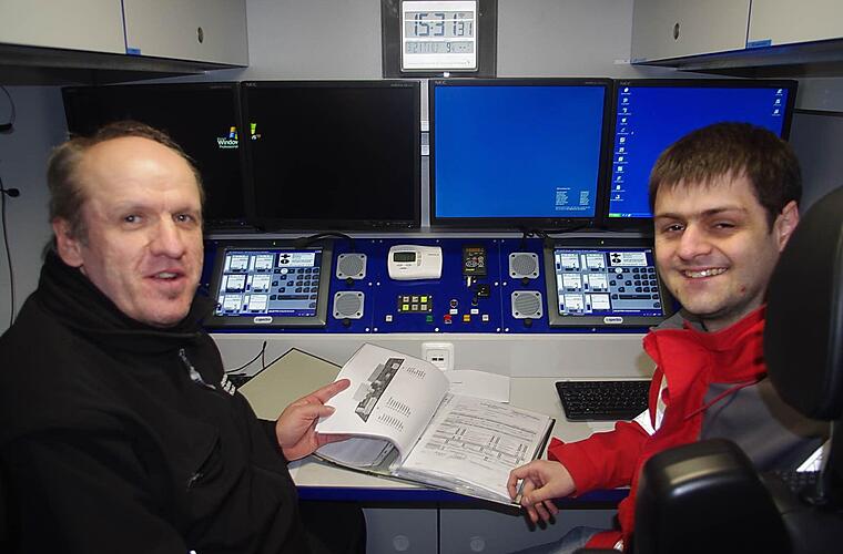 Mario Ziener und Rettungsdienstleiter Martin Schmidt sitzen im Einsatzleitwagen. Gemeinsam schauen sie sich die Einsatztagebücher der beiden "Spezial-Einheiten" Unterstützungsgruppe Sanitätseinsatzleitung (UG-SanEL) beziehungsweise Schnell-Einsatzgruppe "Information und Kommunikation" (SEG IuK) an. Diese unterstützen bei Einsätzen den BRK-Einsatzleiter bei besonderem Koordinationsbedarf für den Sanitäts- und Betreuungsdienst. Das Fahrzeug ist mit der neusten IT- und Digitalfunktechnik ausgestattet, um damit bei Einsätzen eine optimale Kommunikation an der Einsatzstelle sowie die Koordination der Helfer und der Einsatzmittel zu ermöglichen.