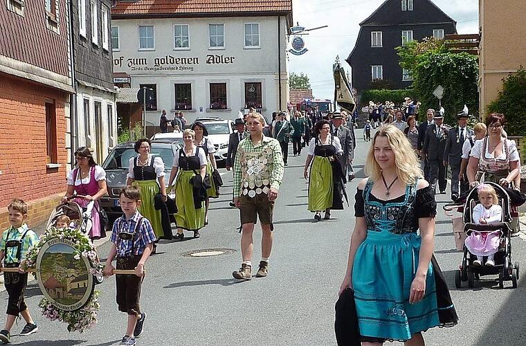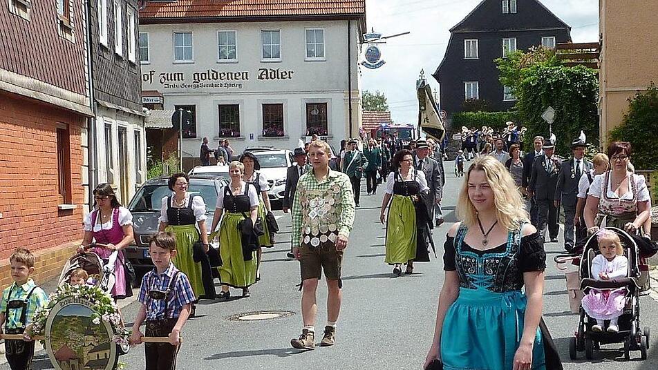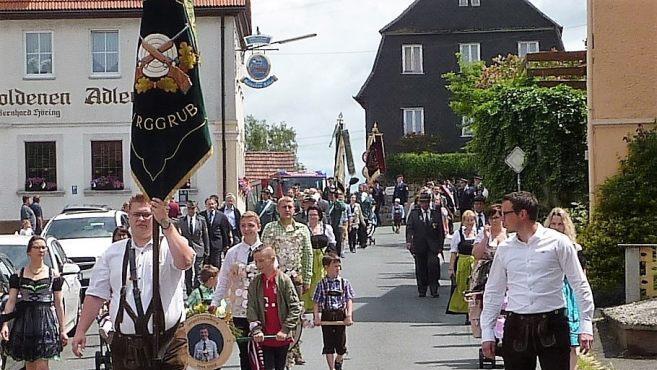 Von der Hohen Straße aus bewegte sich ein stattlicher Festzug, angeführt von Jungschützenkönig Sven Dietz und Kaiser Alexander Ehrsam mit den Schützendamen und Ehrenmitgliedern sowie Oberschützenmeister Uwe Günther durch den Ort zur Festhalle. Es folgten Landrat Klaus Löffler, Bürgermeister und Schirmherr Rainer Detsch mit den Gemeinderäten sowie Pfarrer Michael Foltin. In großer Zahl zeigten vor allem die Soldaten- und Reservistenkameradschaft Burggrub, der 1. FC Burggrub sowie die Fan-Clubs Präsenz. Für zünftige Marschmusik sorgten der Musikverein Neukenroth mit dem Kreisdirigenten Roman Steiger, der Musikverein Größau-Posseck unter der Stabführung von Jens Lang sowie die Stadtkapelle Teuschnitz mit ihrem Dirigenten Bernd Jungkunz. Für die akustische "Begleiterscheinung" waren die Mitwitzer Böllerschützen zuständig.
