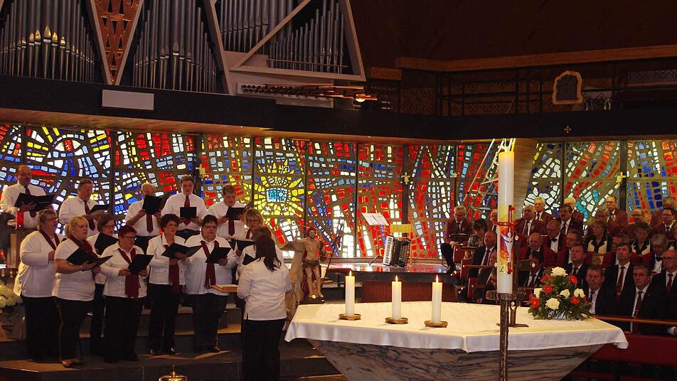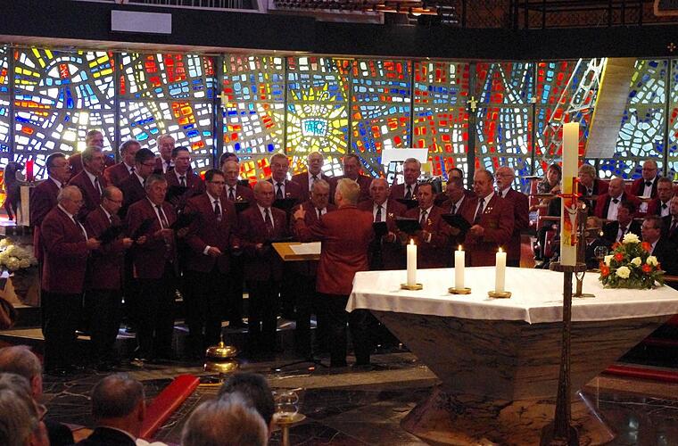 In ihrem schmucken Erscheinungsbild haben die Chöre auf den Bänken rechts und links des kelchförmigen Marmor-Altars Platz genommen und warten auf ihren Einsatz. Sie haben herrliche Liedbeiträge vorbereitet - geistliches Liedgut aus mehreren Jahrhunderten bis in die Neuzeit. Nacheinander treten sie nach vorn. Jedes Mal, wenn einer der Dirigenten zum Taktstock greift, entlädt sich die gespannte Stille in einem fulminanten Klangerlebnis.