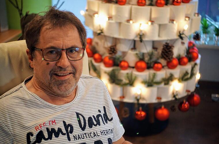 Er kauft immer Zehnerpackungen, sagt Roland Ströhlein, als er noch einmal die Ausmaße seines Corona-Baums vorrechnet. 2,46 Meter hoch. Zehn Ebenen. 256 Rollen weißes Toilettenpapier. Immerhin vier Rollen sind fürs Bad geblieben. Der Baum endet knapp unter der Decke und für den Erbauer ein verrücktes Jahr mit den Worten: "Damit kann mir die Corona-Krise im wahrsten Sinne des Wortes am Arsch vorbeigehen."