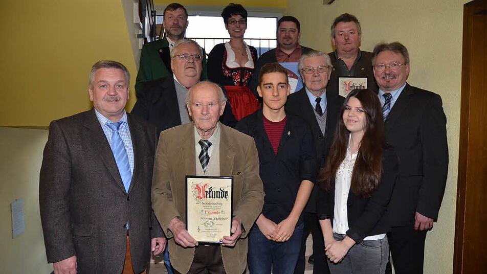 Die Ehrung durfte der Vater des Musikers, Werner Pörner, als Bezirksvorsitzender des NBMB vornehmen. Für fünf Jahre Musizieren wurden Sophia Biedermann, David Fehn, Moritz Ströhlein, Lena Schneider und Sebastian Neubauer durch Kreisvorsitzenden Wolfgang Müller mit einer ganz neu vom NBMB herausgebrachten Ehrennadel geehrt. Für langjährige Treue wurden folgende passiven Mitglieder geehrt: 25 Jahre: Markus Lieb, Katja Suffa-Weißkopf, Michael Suffa-Weißkopf; 40 Jahre: Norbert Lang und Elfriede Schmitt; 50 Jahre: Hans-Jürgen Hempfling, Helmut Schirmer und Josef Wich.