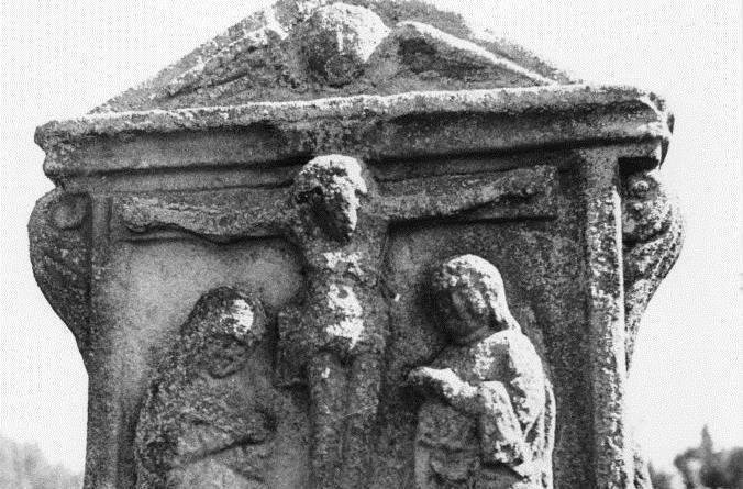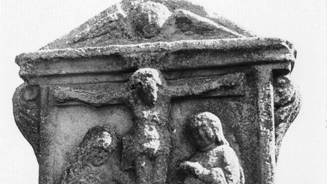 Die entwendete wertvolle Bildhauer-Arbeit zeigte auf beiden Seiten identisch die Kreuzigungsgruppe mit Christus am Kreuz, flankiert von seiner Mutter Maria und dem Apostel Johannes. Als Zierelemente dienten an den Seiten des flachen Aufsatzes schön ausgearbeitete Blattvoluten. In den beiden Giebelfeldern befand sich je ein geflügelter Engelskopf. Die Bildhauerarbeit war in der Zeit um das Jahr 1600 entstanden.