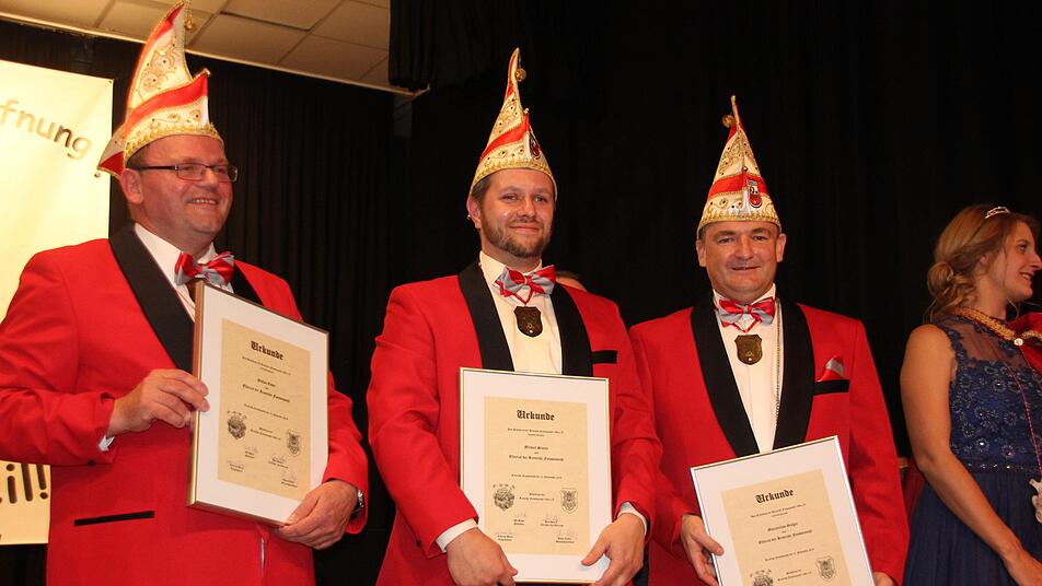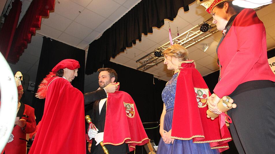 Apropos Elferrat: Deren illustre Schar ist inzwischen auf die stattliche Zahl von 37 (!) angewachsen. Also nix mit elf. Mehr passen bei den Büttenabenden gar nicht auf die Bühne. Am Samstag wurden drei weitere Männer mit rotem Sacco, dem traditionellen Outfit der Elferräte, ausgestattet: wie erwähnt der bisherige Prinz Maximilian Gröger, dann auch noch Stefan "Ed" Ender und Michael Simon.