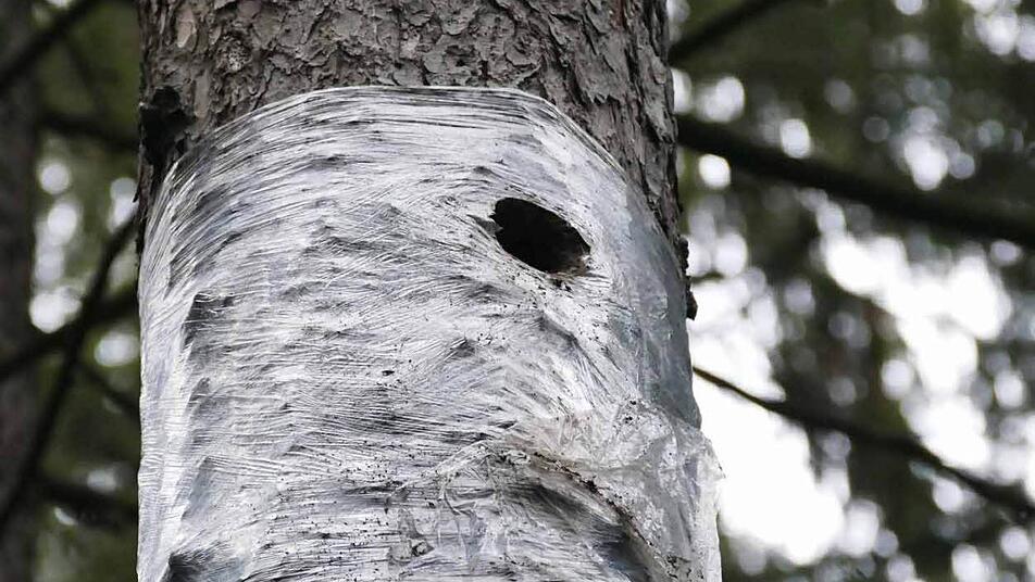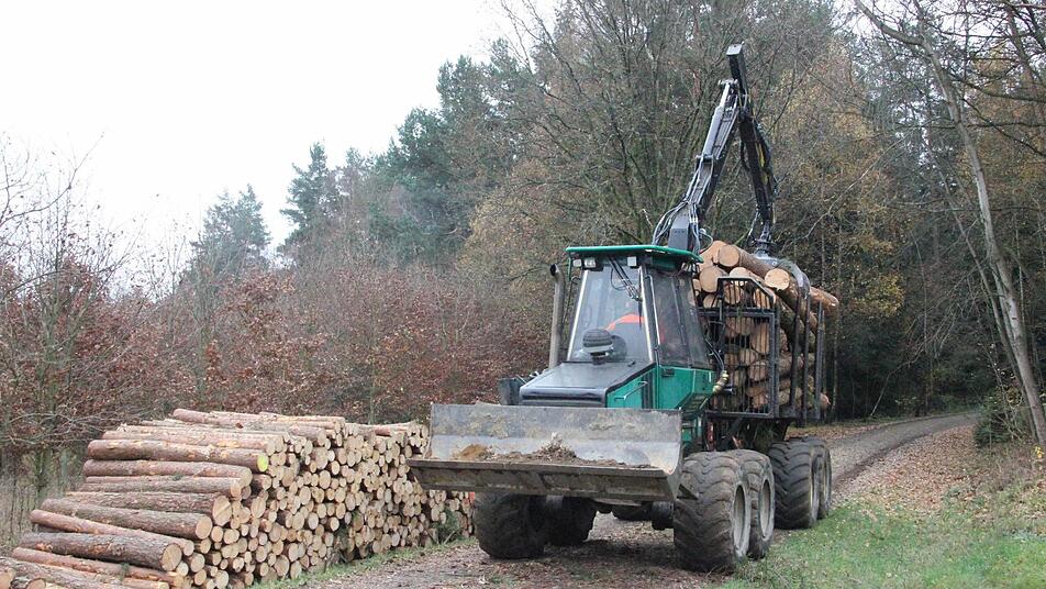 Es geht Schlag auf Schlag: Im Viertelstundentakt kommt der Holzrücker mit einer Riesenladung an Stammstücken vom Rainberg zum Lagerplatz am Waldrand bei Wildenberg und lädt die Fuhre ab. Tobias Wicklein sprüht die Stämme mit Forstfarbe an, damit man jedes Stück Holz dem entsprechenden Waldbesitzer zuordnen kann.