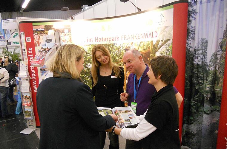 Zwei feste Partner Unterstützt wird sie an allen fünf Messetagen von zwei so genannten "festen Partnern", die permanent am Stand vertreten sind. Das ist zum einen das Aparthotel Steinwiesen mit Bob Neubeck und Sabine Reif-Beck und zum anderen die Ferienregion Selbitztal-Döbraberg. Hinzu kommt jeden Tag eine andere Region aus dem Frankenwald, die in Nürnberg ihr Angebot präsentiert. Den Auftakt machte am Mittwoch Wirsberg. Gestern war es das Hotel "Haus Birken" aus Bad Steben, heute ist es Schwarzenbach am Wald.