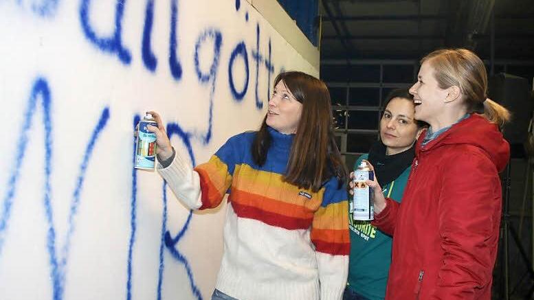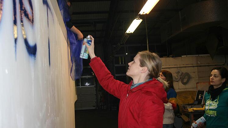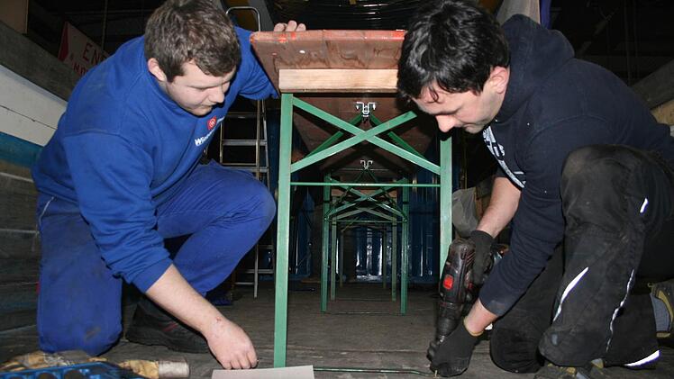 Die Stimmung in der Halle ist von Begeisterung und Erwartungsfreude geprägt. Sitzen die Schrauben fest, verläuft die Farbe nicht? Ist das Notstromaggregat angebracht? Einige Mitglieder des FC Stockheim und auch einige "Fußballerfrauen" sind im Einsatz. Es wird gehämmert, die Seitenwände werden besprüht, der Lkw-Anhänger dekoriert. Zuvor wurden an den Lkw-Seiten mehrere Holzplatten befestigt. Man merkt, die FC-ler sind voll bei der Sache.