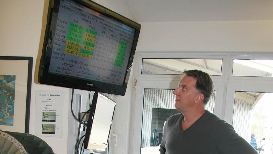 Auf 18.000 Quadratmetern lagern Eisen und Metalle aller Art. "Allein dieser Edelstahlberg hat einen Wert von 400.000 Euro. Aber der Preis ist derzeit nicht gut, deshalb lasse ich ihn noch liegen", zeigt Frank Mölter auf. Das Geschäft mit Schrott ist reinste Spekulation. Aus diesem Grund hat Frank Mölter einen direkten Draht zur Börse. Rund um die Uhr laufen im Büro die aktuellen Kurse, um die Preise brandaktuell berechnen zu können.