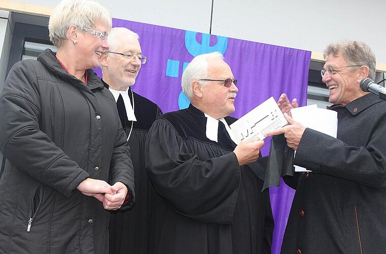 Glückwünsche des Landkreises. Auch Vertreter der Raiffeisen-Volksbank sowie der katholischen-Heilig-Geist-Kirche waren gekommen, um zu gratulieren. Barbara Zech und Karsten Nemmert von der Raiffeisenbank übergaben sogar einen Scheck über 1000 Euro.