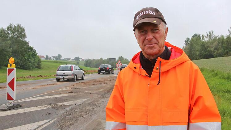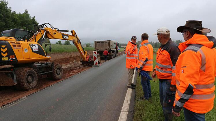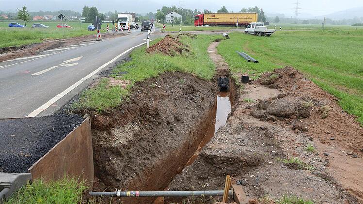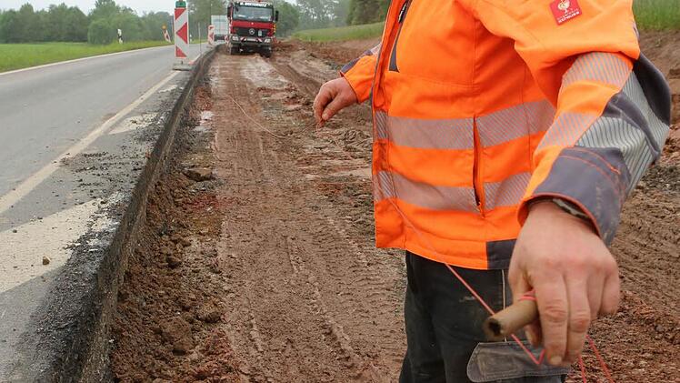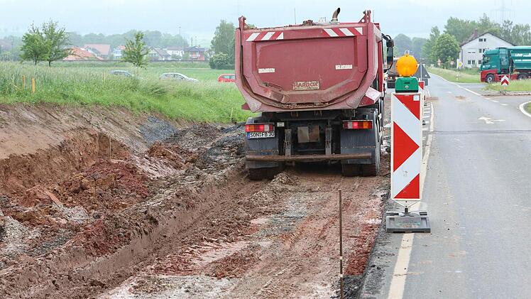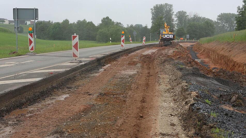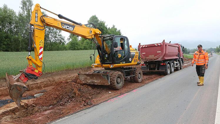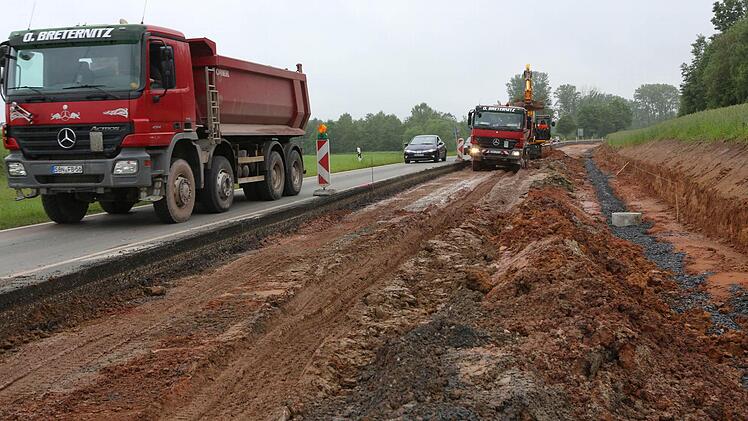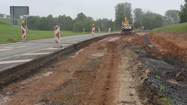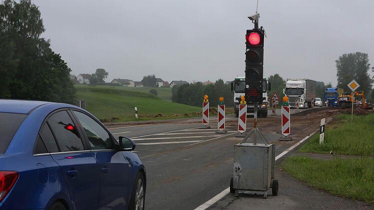 Während der Bauphase wird der Verkehr mit Ampelregelung wechselseitig über das verbliebene schmale Stück der Bundesstraße geführt. Das ist nur wenig breiter als die Brummis, die drauf fahren. Aber deren Lenker sind so versiert, dass sie mit hohem Tempo über den schmalen Grat brettern. Wenn die Verbreiterung der Bundesstraße abgeschlossen ist, sind die Arbeiten aber noch nicht zu Ende. Dann wird die Deckschicht zwischen der Abzweigung nach Haig und der Ampel bei Haßlach auf einer Länge von 500 Metern saniert. "Das wird erst anschließend gemacht, damit die Beeinträchtigung des Verkehrs nicht zu groß wird", sagt Bauleiter Oliver Rühr von der Servicestelle Kronach.