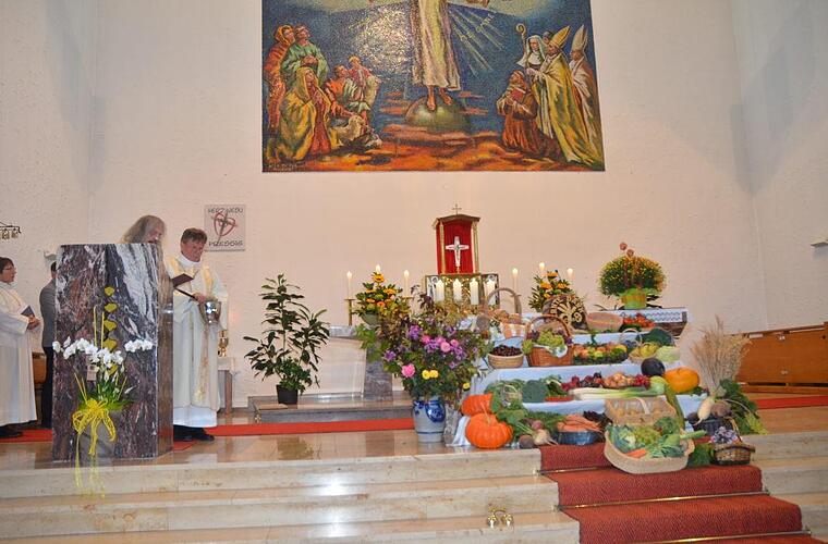 In der Herz-Jesu-Kirche zelebrierte Pater Helmut Haagen den Festgottesdienst. Die Festpredigt sprach Diakon Alfred Trebes, der zugleich BBV-Ortsobmann von Pressig ist. Trebes ist von Kindheit an mit der Landwirtschaft vertraut und konnte daher auf fundierte Erfahrungen aufbauen. Er meinte, dass das Erntedankfest heute sicher eine andere Bedeutung habe als vor 50 oder 100 Jahren. Während uns heute Nahrungsmittel in Hülle und Fülle zur Verfügung stünden, hat die ältere Generation auch noch andere Zeiten erlebt. Doch die Wohlstandsgesellschaft habe auch Schattenseiten. Der Mensch sei leider in der Lage, das Gute, was er schaffen kann, ins Negative zu wandeln. Dabei sprach er vor allem vom Missbrauch hochwertiger Lebensmittel, die manchmal einfach sorglos als Abfall entsorgt werden. Im täglichen Lauf der Nahrungsmittel stehen sich Erzeuger und Verbraucher gegenüber und als Dritter der Handel.