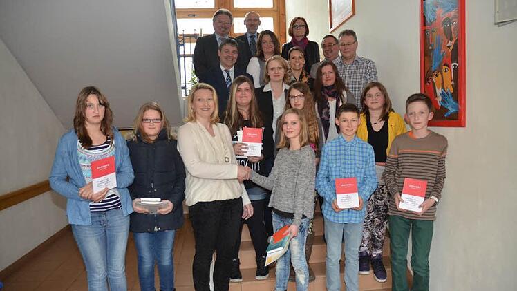 Landratstellvertreter Gerhard Wunder gratulierte der Lesekönigin Lena Weber im Namen des Landkreises Kronach und überreichte eine Urkunde und einen Gutschein. Melanie Renk von der Buchhandlung Roseneck überreichte Urkunden und jeweils ein Buchgeschenk an die Teilnehmer. Schulrat Mario Schmidt und Bürgermeister Hans Pietz schlossen sich den Glückwünschen an.