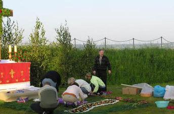 Ebenfalls mindestens schon 30 Jahre gestaltet die action 365 den letzten Altar auf dem Melchior-Otto-Platz. Wie Hauptinitiator Heinrich Schreiber betont, stelle die in den 1950-er Jahren gegründete Laienbewegung den ökumenischen Gedanken in den Vordergrund. Probleme in Kirche und Gesellschaft sollen damit thematisiert und diskutiert werden. "Bei der Schwedenprozession handelt es sich um eine Friedensprozession, die zu einer gerechten Welt mahnt", so der Bildhauer. Dieses Jahr wird das Leitwort " Damit ihr Hoffnung habt" des 2. Ökumenischen Kirchentags vom 12. bis 16. Mai 2010 in München aufgegriffen. Gut anderthalb Stunden benötigt er zusammen mit drei weiteren Helfern, um am Samstag den Altar - eine kunstvoll bearbeitete Tischlerplatte - aufzubauen und zu schmücken.