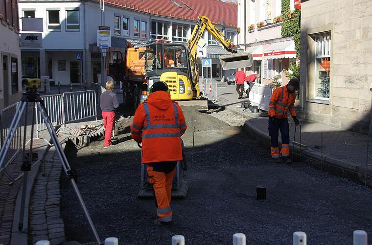 Die Spitalstraße ist zwar seit einiger Zeit für den Schwerverkehr gesperrt, aber in den Jahren zuvor rollten unzählige Brummis über die Spitalbrücke Richtung Innenstadt, drückten tiefe Spurrillen in das Pflaster. Die werden in dieser Woche beseitigt. Dabei übernehmen die Männer des städtischen Bauhofs die meisten Arbeiten. Das Pflaster und der Splitt werden entfernt, Schotter mit einer Rüttelplatte verdichtet.